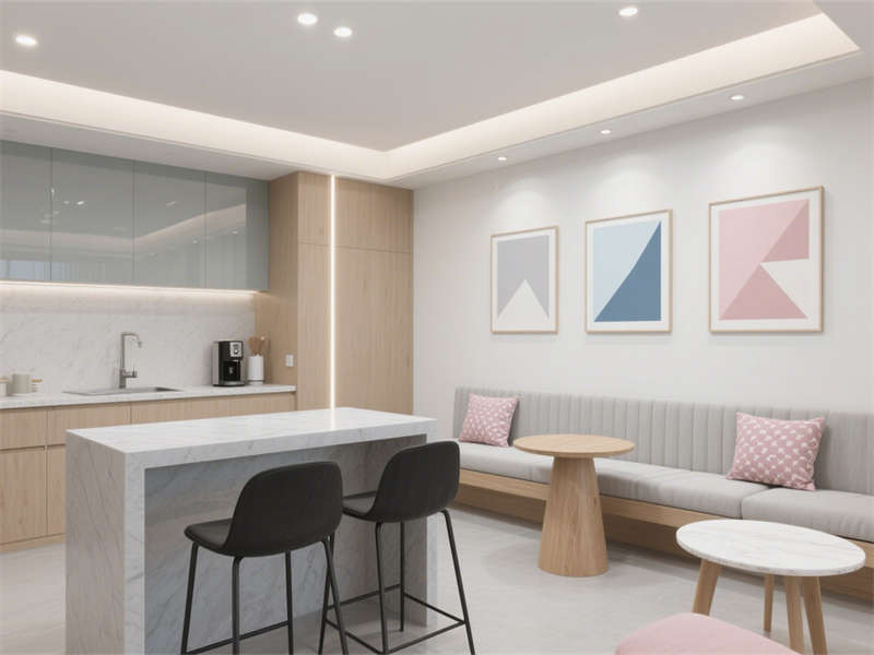 外觀設(shè)計上,采用淺灰色墻面搭配超白玻璃幕墻,玻璃內(nèi)側(cè)的品牌標(biāo)識與門前綠植相呼應(yīng),弱化了建筑的冷硬感,展現(xiàn)出簡約大氣的辦公形象。進入室內(nèi),前臺接待區(qū)以淺灰與米白為基礎(chǔ)色調(diào),L型前臺搭配柔和燈光,等候區(qū)的布藝沙發(fā)與原木元素結(jié)合,給訪客帶來溫和專業(yè)的第一印象。?