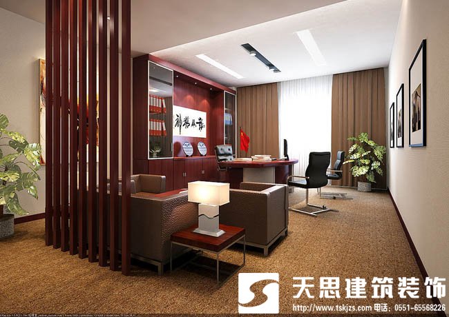 作為總經理的辦公室,在設計裝修時除了考慮使用面積略大之外,一般采用較矮的辦公家具設計,目的是為了擴大視覺空間,因為過于擁擠的環境束縛人的思維,帶來心理上的焦慮等問題。總經理是公司決策的高層人員,為其打造一個良好的辦公環境是極為重要的。