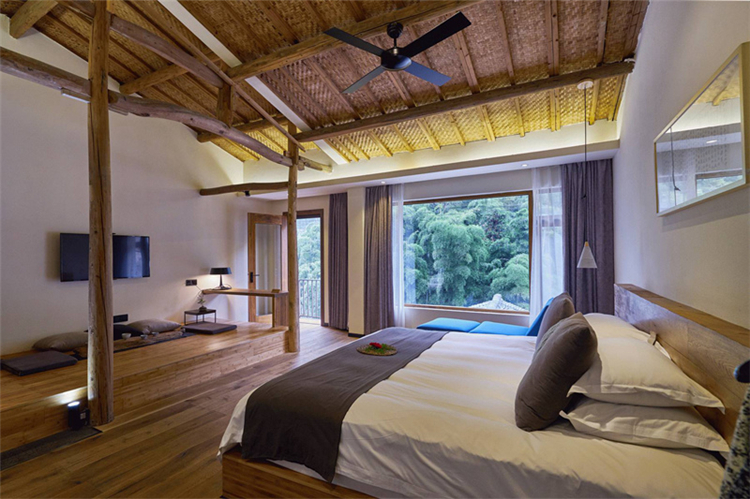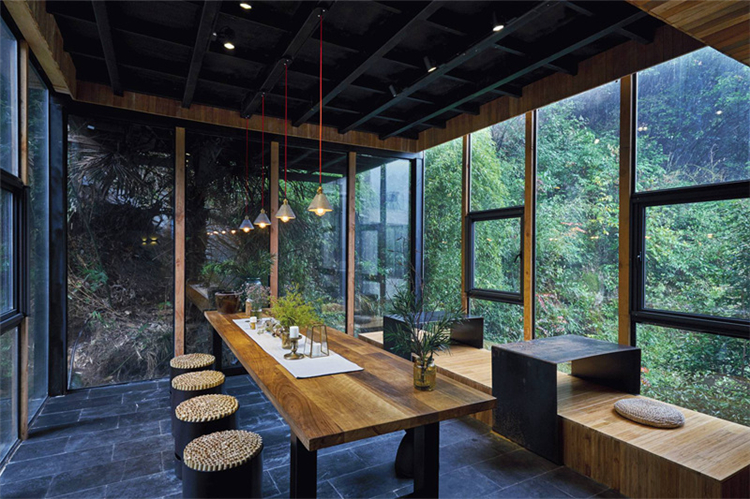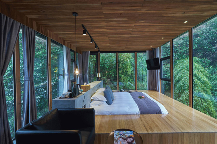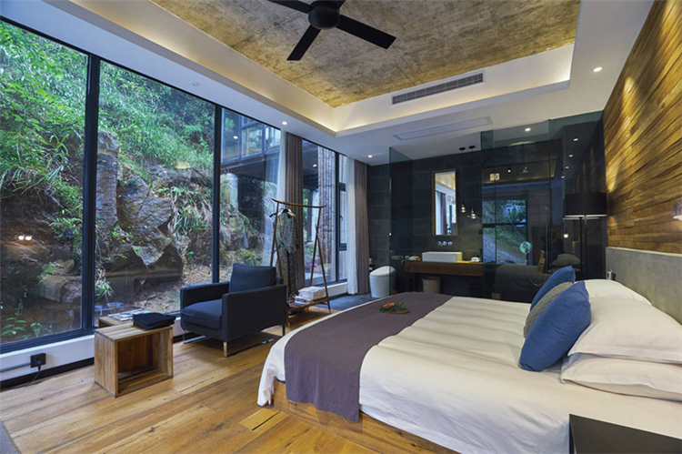 玻璃為墻、為窗,鋼結(jié)構(gòu)吊頂,木色為板,與周圍環(huán)境相得益彰,仿佛置身山間之色;睡醒的清晨,清新的空氣迎面而來,拂去懶懶睡意;用山間的寧靜,洗去旅途疲勞,或者城市的浮華與躁動,體味另一番人生心境。
