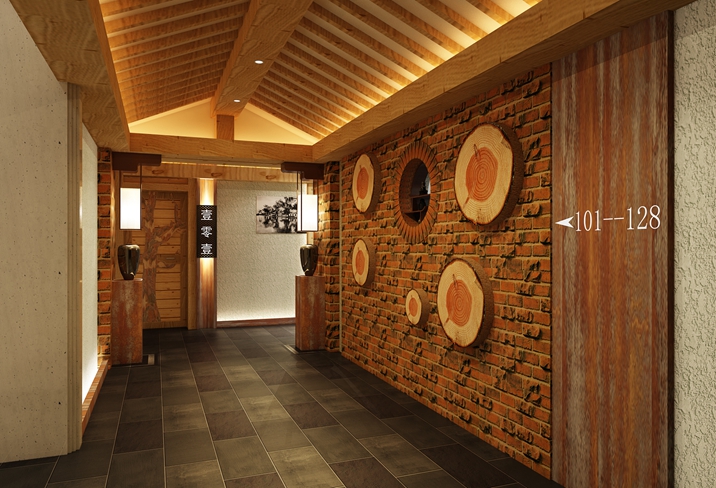 該項目主要是以近代的炕及木制品為元素,房間的床、電腦桌、電視柜、床頭柜都是用紅磚清水墻砌的,墻面是白色的彈涂顆粒飽滿十分的美觀,頂面局部采用的是桑拿板吊頂,其余部分為石膏板吊頂噴彈涂,加上特色的壁燈,讓人置身其中有種回到中國近代的感覺。