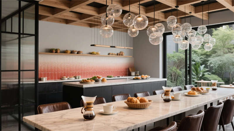 全日餐廳以陶土色格柵天花呼應(yīng)徽州傳統(tǒng)工藝,吹制玻璃吊燈如晨露凝結(jié)空中;宴會(huì)廳則化身未來(lái)劇場(chǎng),波浪形織物天花與全息投影幕布共舞光影。行政樓層的商務(wù)休息區(qū),深灰毛氈墻面與古銅金屬細(xì)節(jié)沉淀出理性優(yōu)雅,窗外綠意透過(guò)玻璃隔斷滲入交談空間。從屋頂無(wú)邊泳池俯瞰,建筑與巢湖的瀲滟水色遙相呼應(yīng),于繁華處開辟一方隱逸凈土——這里不僅是居所,更是一場(chǎng)喚醒感官的設(shè)計(jì)敘事。