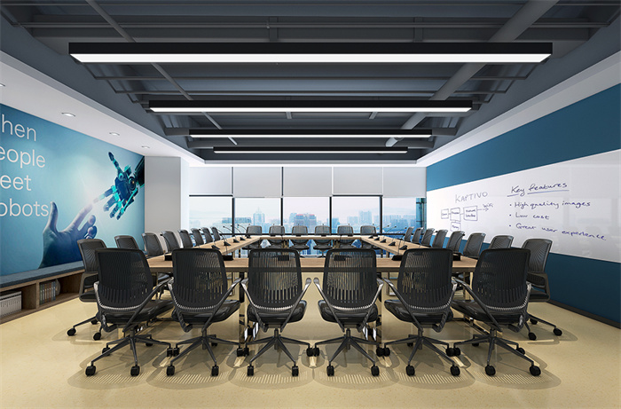 2、該辦公室裝修項目主要是使用者作為科技類產品的研發空間,要求足夠寬敞,空間的開放度與靈活度自由變換,辦公桌實現可隨意拼裝組合。設計師在設計上立足于;靈活共享的主線,以設計、現代、開放和連通為主題,著眼于科技發展的今天和未來,創造出一個極富時代感和超前性的辦公空間。整個辦公空間以白色為基底色,輔以藍色的協調、中和,黑、 白、藍成為標準層的主色系,完美將辦公層的空間格局進行分割,營造出現代簡約、自由開放的高端科技感。長方形燈具應用突出了現代科技的嚴謹態度,極大凸顯企業的文化感與產品前沿的設計感。會議室根據實際需求,實際軟裝時則以多彩元素為主題,一眼望去 ,布滿了明快的顏色 ,活潑卻不繁雜 ,采用的半透明亞克力玻璃椅是點睛之筆,帶給空間無限的靈動感。黑板漆墻面設計則豐富了使用者的功能需求,達到裝飾和功能并存的目的。靈活的辦公桌還可自由變換,滿足不同需求的會議要求。