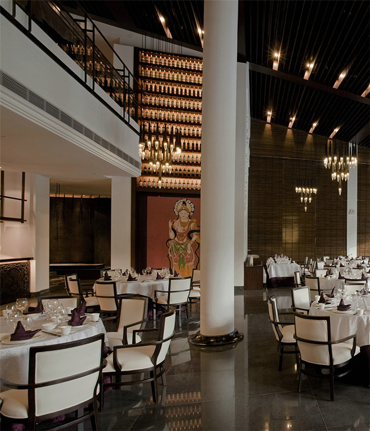 穿過悠長的走道,在灰白色空間配合溫暖沉著木色格子窗棱,讓客人逐步感受一種優雅的熱情。天花的黑色線條設計,帶有極強的導向性,墻面上特別設計的壁燈,與柱體結合,極大地豐富整個空間的層次感和趣味性。