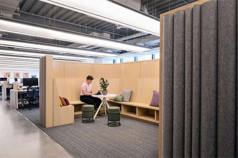 空間的聲學(xué)設(shè)計(jì)也經(jīng)過專業(yè)團(tuán)隊(duì)的仔細(xì)考量,以確保靈活的協(xié)作空間具有吸引力、舒適性和高效生產(chǎn)力。各種類型的會(huì)議空間從大型會(huì)議室到全面毛氈飾面的靜音“工作艙”;在辦公桌上方,采用了定制的聲學(xué)毛氈弧形擋板集成照明裝置,由此優(yōu)化開放工作區(qū)的聲學(xué)效果。